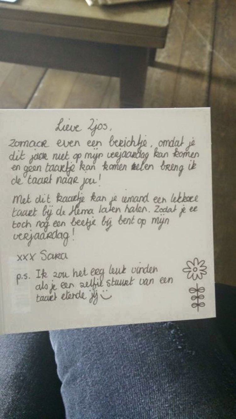 Ο χρήστης Zjos Dekker στο Twitter: "Vandaag is mijn beste vriendin jarig. 4 jaar geleden was ik te depressief om op haar verjaardag te komen. Ze stuurde mij een kaart en hema